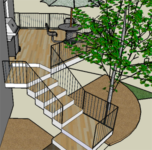 Area was at a premium therefore when designing the staircase we sectioned off the steps to allow small blocks of steps as opposed to one long staircase, Usually when step orientation is changed there is a loss of usable patio surface, however we designed the steps into an obscure area of the backyard, The insertion of a large deciduous tree to the deck indent will give some much needed privacy.