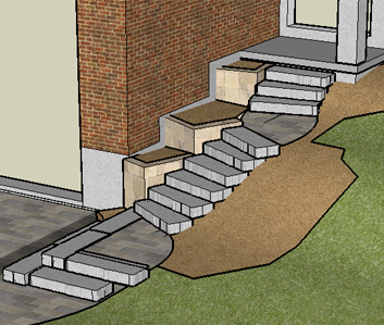 The existing stairs had failed and over time the entrance was deemed unsafe, concrete modular Step Stackers we used to create a new staircase and the addition of 3 terraced planter walls alongside the house wall to provide planting pockets.