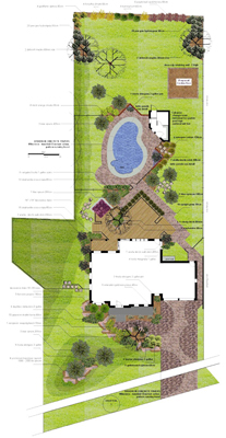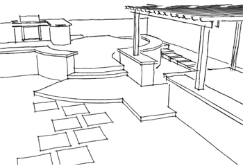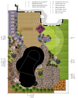 This is a general hardscape layout displaying the "bones" of the landscape, for entertaining the deck contains features such as overflow seating incorporated into the deck and a generous BBQ island area that can contain barstool type seating. There is a separate pergola area that contains two entrances one passive steppingstones and the other from the lower paver patio. This overall design is what I would consider a low-profile landscape whereby the plant material can soften some of the curvy-linear lines and provide interesting seating areas.
